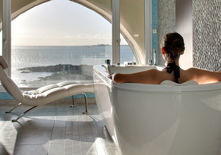 Posé sur une presqu’île rocheuse, l’Aqua Phénicia, le Spa marin du Domaine de Rochevilaine, offre de nombreuses installations avec l’Océan à perte de vue.