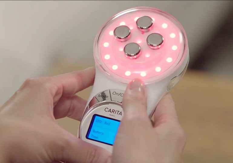 MY C.L.E., un appareil de beauté augmentée à domicile Carita, qui combine 2 énergies du C.L.E. (Cinetic Lift Expert) cabine : les micro-courants, (disponibles en 5 niveaux d’intensité selon la sensibilité de la peau), qui stimulent les fibres musculaires de la peau pour un effet instantané sur la fermeté et le lift afin de redessiner les contours.