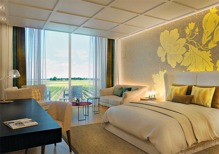 L’hôtel propose 49 chambres (40-45 m2) qui bénéficient toutes sans exception d’une vue à couper le souffle sur les vignes. L’hôtel disposera également de deux restaurants, dont un gastronomique, confié au chef Jean-Denis Rieubland, mais aussi un bar, trois vastes terrasses, un Spa de 1 500 m2 en collaboration avec Biologique Recherche, qui sera dirigé par Elise Roulon, deux piscines et de nombreux espaces de réception. Construit comme un amphithéâtre romain, le bâtiment est l’oeuvre de l’architecte rémois Giovanni Pace, qui a imaginé un projet minimaliste en parfaite harmonie avec le paysage qui l’entoure. L’architecture d’intérieure a été confié à Sybille de Margerie qui a imaginé un véritable écrin contemporain avec en toile de fond les vignes à perte de vue.