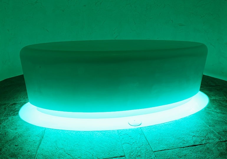 Leur capacité à mettre en œuvre le concept original de ce spa tient non seulement à l’installation de ces « bulles de détente », mais également à la fabrication sur mesure d’une table de gommage/enveloppement chauffante en solid surface blanc, d’une douceur incroyable et sur laquelle la cliente peut recevoir son soin, être rincée directement sur la table sans avoir besoin de se lever ni de s’extraire de la douceur de la cabine car une douchette permet de procéder au rinçage, tandis que l’eau disparait comme par miracle grâce à un ingénieux système caché sous la table.