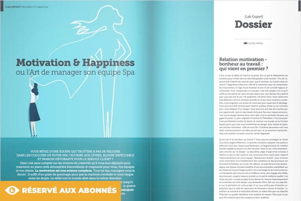 Vous rêvez d’une équipe qui trottine à pas de velours dans les couloirs de votre Spa ? Sourire aux lèvres, blouse impeccable et passion dévorante pour le service client ? Mais c’est sans compter sur les torrents de créativité qu’il vous faut déployer pour maintenir en place cette atmosphère bienveillante et inspirante pour vous, vos équipes et vos clients. La motivation est une science complexe. Tous les Spa managers vous le diront : il suffit d’un grain de gommage pour que la machine s’emballe et vous claque entre les doigts. La veille tout le monde allait dans la même direction.Ce matin vos esthéticiennes tirent à vue sur les réceptionnistes. Donnez-leur jusqu’à midi sans intervenir et vous verrez apparaitre les sacs de sable et les tranchées : la guerre est déclarée. Quelles sont les clés essentielles à connaître et utiliser pour conjuguer motivation et happiness au quotidien Je vous propose dans cet article un tour d’horizon des outils fondamentaux.» POUR LIRE LA SUITE DE CET ARTICLE, abonnez vous et recevez la 12ème édition de notre Magazine Spa Sense of WELLNESS ! ABONNEZ-VOUS À PARTIR DE 15€ » Je découvre la vidéo » Je mabonne » J’achète le numéro