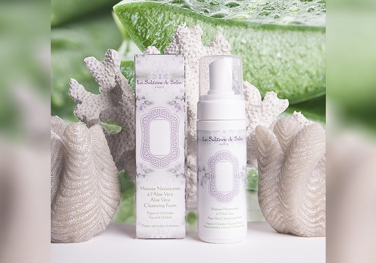 La mousse nettoyante délicatement parfumée à la senteur figue et orchidée, La Sultane de Saba, nettoie la peau tout en douceur.