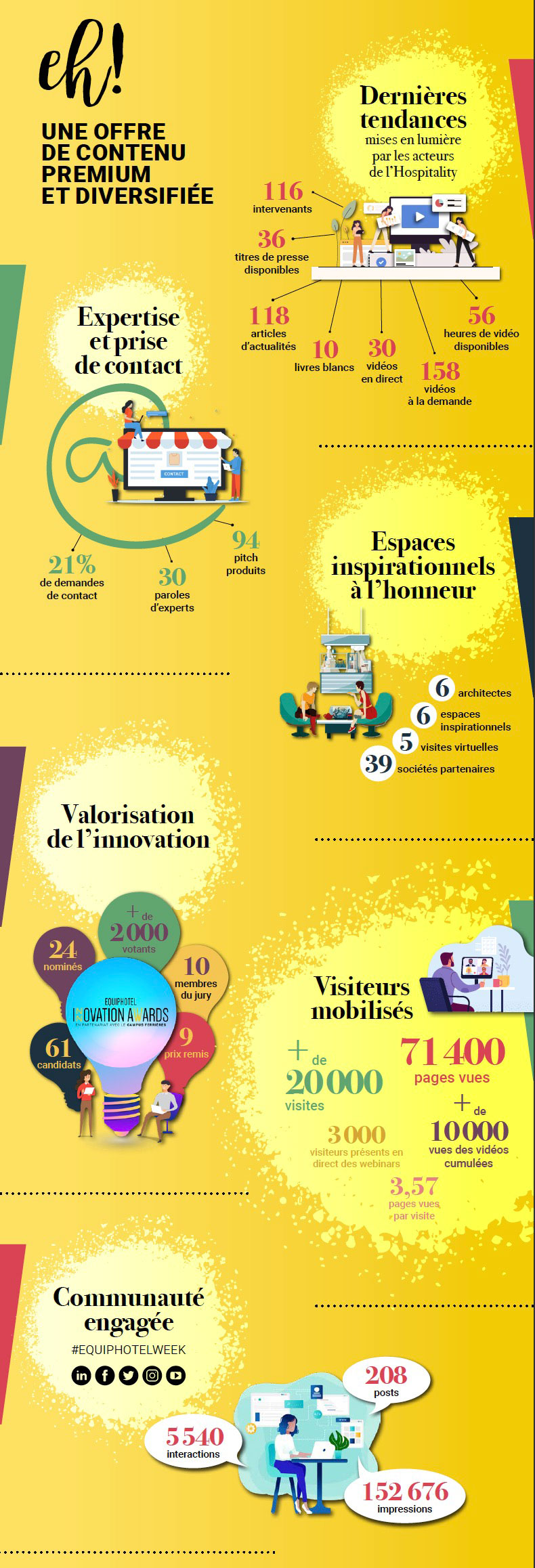 Avec 116 intervenants, 158 vidéos à la demande, 30 webinars en direct, 10 livres blancs et 118 articles d’actualité, EquipHotel WEEK a donné une nouvelle impulsion au secteur de l’Hôtellerie-Restauration.