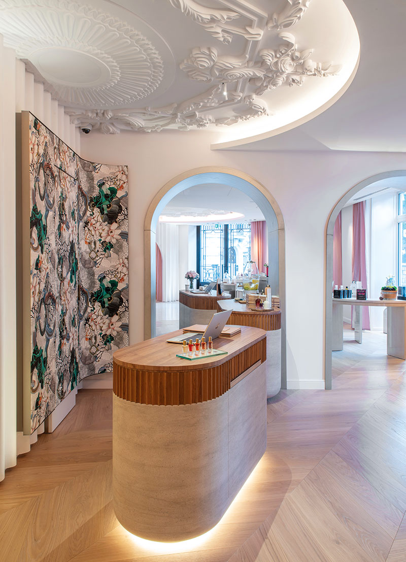 Commençons par le premier pilier du concept de N Le Spa, Découverte, matérialisé par le concept store. Cet univers créatif et interactif est scénographié autour de trois consoles expérientielles mobiles, l’une dédiée aux produits cosmétiques, la seconde aux nutricosmétiques et la troisième aux parfums. Une sélection uniquement made in France pour célébrer là encore une des valeurs fondatrices des lieux : valoriser le savoir-faire français. Un espace qui se veut aussi un lieu de vie, avec la possibilité d’y créer des vernissages d’artistes de la région, afin de rester dans la tradition de mécénat de Jeanne Augier. Un support de nouveaux talents que l’on retrouve aussi dans la collection éphémère qui présente de nouvelles marques cosmétiques talentueuses pour une durée limitée, maintenant cette quête d’excellence et de dénicheur de tendances qui fait aussi partie de l’esprit de la Maison.
