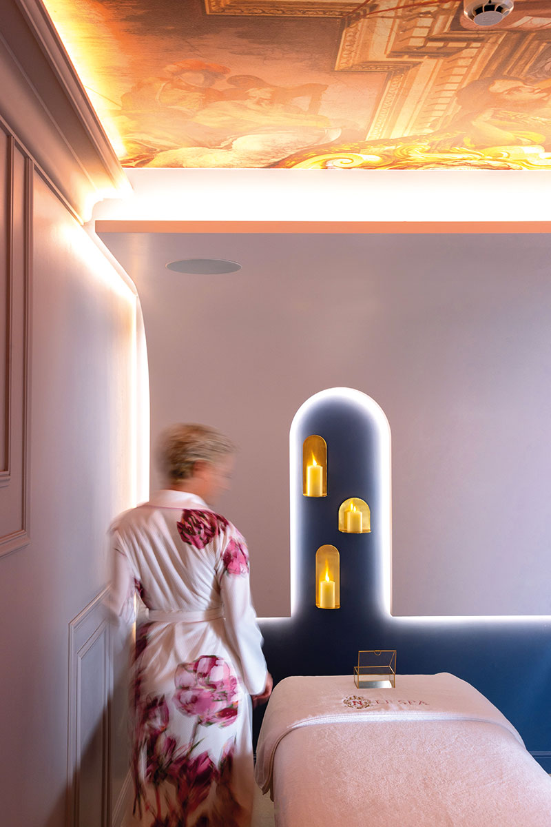 Pour le troisième et dernier pilier, Immersion, plongeons dans l’univers des espaces de soins où le bien-être se dévoile comme une œuvre vivante, sculptée par le savoir-faire des Spa praticien(ne)s, véritables artistes de la beauté et du bien-être. Un art qui s’exprime aussi dans les cabines, chacune avec leur identité, à l’image des 128 chambres du Negresco. « Outre leur différence en termes de design, j’ai aussi souhaité thématiser chacune de ces cabines en fonction d’éléments emblématiques de Nice, une manière de rendre hommage à la ville que Le Negresco contribue à faire rayonner en France et à l’international », commente Patrick Saussay. C’est ainsi que chacune des six cabines de soins porte le nom d’un lieu emblématique de « Nissa la bella », comme aime à l’appeler ses habitants : Diamant Vert pour la cabine sous affusion, en référence à la spectaculaire serre de 7 000 m2 et 25 m de haut, en forme de pyramide, que l’on peut découvrir au Parc Phoenix, installé le long de la Promenade des Anglais. La cabine duo revêt le nom de Saleya, un lieu de vie incontournable au cœur de la vieille ville, connu pour son iconique marché aux fleurs, tandis que les autres cabines nous emmènent à Nice Art, le musée d’Art Moderne et Contemporain ; Lascaris, un musée dédié à l’art et à la musique des XVII et XVIIème siècles et pour finir Promenade (des Anglais), dont le Negresco est le centre. Des références qu’il est utile de vous préciser car elles ont inspiré la réalisation des six œuvres uniques, reprenant chacune les éléments emblématiques des lieux choisis, qui viennent habiller le plafond des cabines afin de prolonger la rêverie artistique. C’est ainsi qu’allongé sur votre table de soins, vous pouvez laisser votre esprit vagabonder, en admirant ces peintures réalisées par l’Atelier Muséo et le Studio Jean-Philippe Nuel.